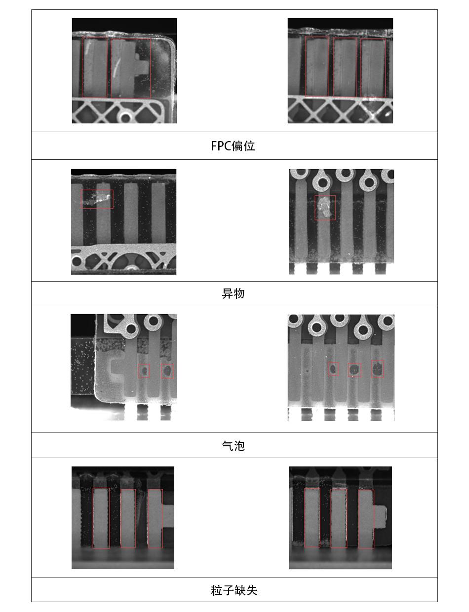 FPC misalignment, bubbles, foreign objects, ACF missing glue, overflow glue, whitening, particle missing, etc
